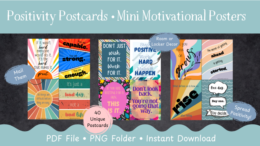These Positivity Postcards are perfect for cheering on students, family, and friends. Use them at home, in the classroom, or on the go. We could all use a little more positivity in our lives!